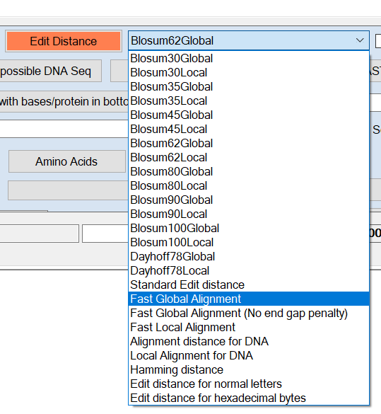 This is now where you can select one of the slower alignment methods such as Blosum90Global which will relax the matching criteria to take into account that amino acids can normally be substituted in nature for others and still result in a similar folding pattern in the protein.